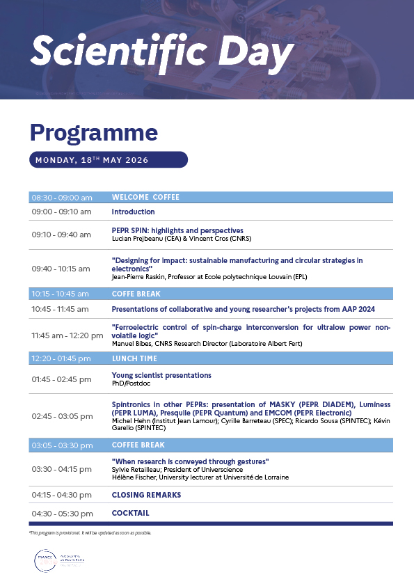 Au programme : des présentations keynote animées par des invités de renom tels que Jean-Pierre Raskin, Professeur à l’École polytechnique de Louvain (EPL) et Manuel Bibes, Directeur de Recherche CNRS au Laboratoire Albert Fert. Nous ferons le point sur les différentes actions et avancées grâce à des présentations des projets collaboratifs et jeunes scientifiques des projets issus du dernier appel à projets ANR 2024. Nous aurons également l’honneur d’accueillir Sylvie Retailleau, Présidente d’Universcience, qui proposera une intervention dédiée à la réouverture du Palais de la découverte, ce qui fera le lien avec notre prochaine grande action de médiation « Un Chercheur, Une Manip » que nous présentera Hélène Fischer, Enseignante-chercheuse à l’Université de Lorraine.